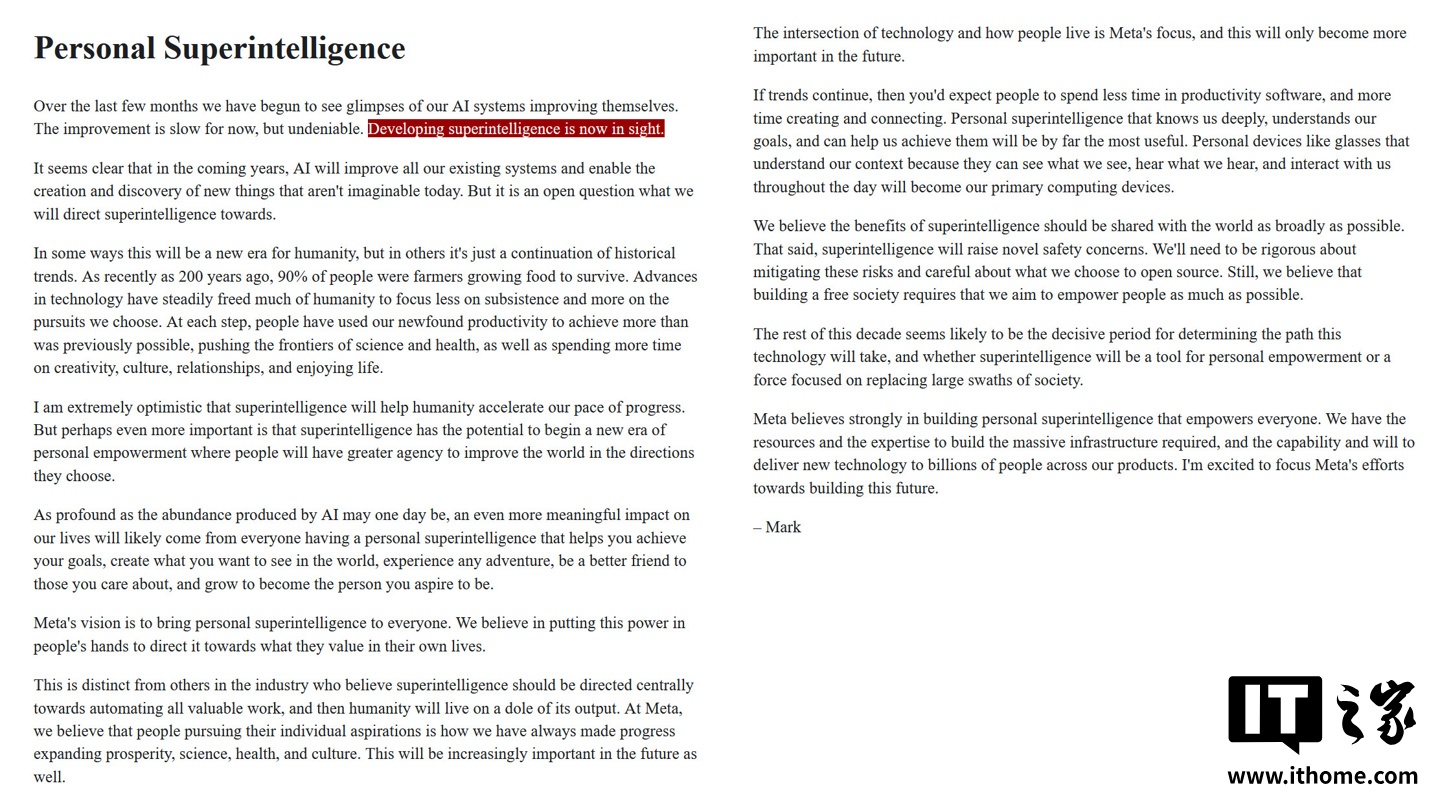 IT之家 7 月 30 日消息,Meta 公司首席执行官马克・扎克伯格于本周三对外公布了其关于“个人超级智能”的宏大愿景,这一举措使该公司的人工智能战略与竞争对手形成差异。